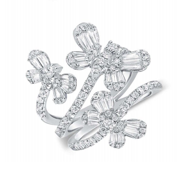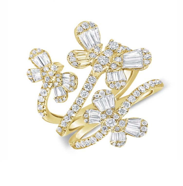 Baguette Diamond Butterfly Ring features a TCW of 1.60 CT. Available in 14K Yellow, White, or Rose gold. Please allow 3-4 weeks for fabrication.