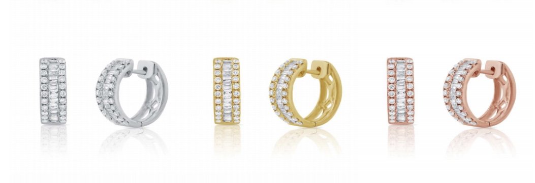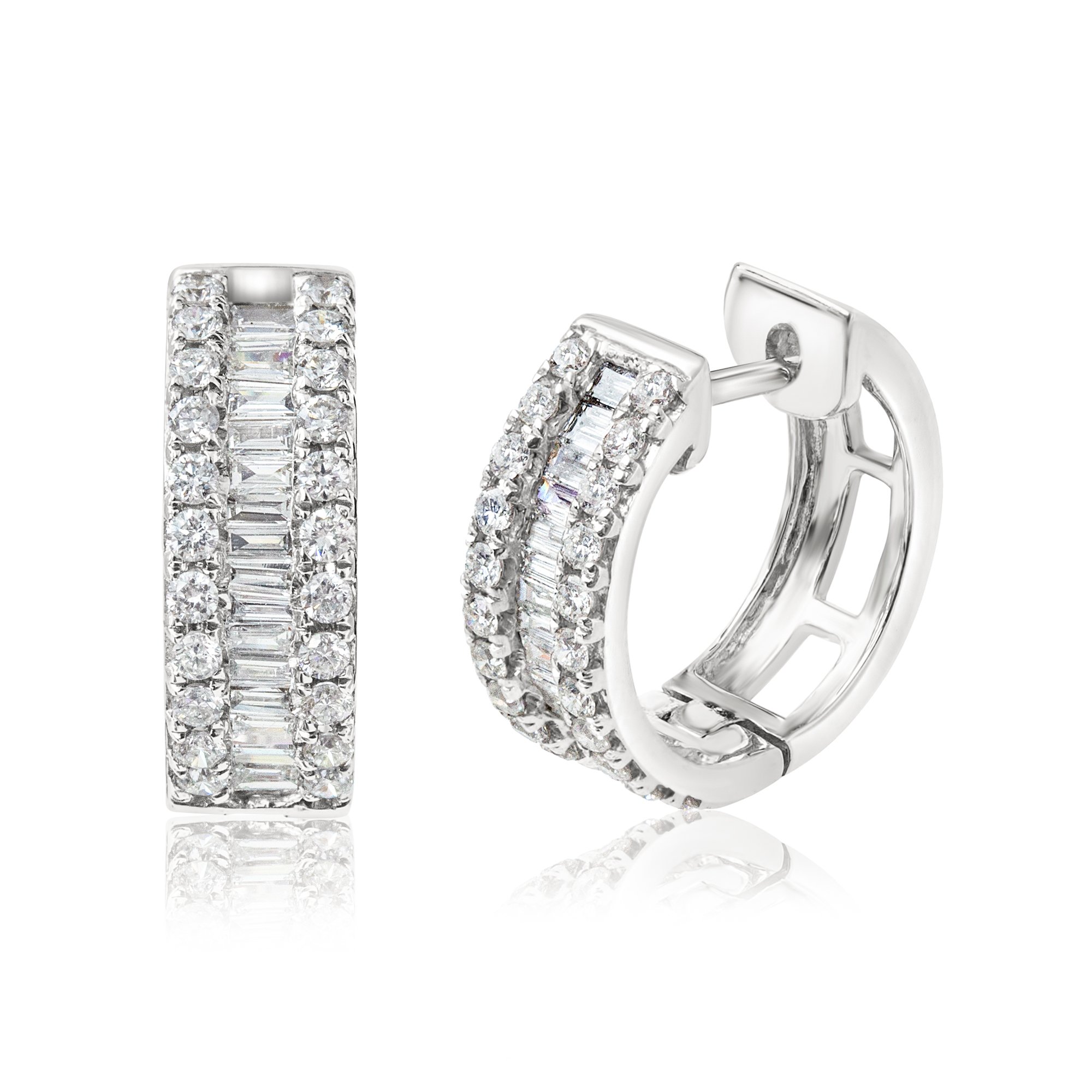 Baguette Diamond Huggies, availble in 14K white, yellow or rose gold, features VS G/H baguette cut diamonds, and round diamonds, TCW is 0.68CT. Please allow 3-4 weeks for fabrication.