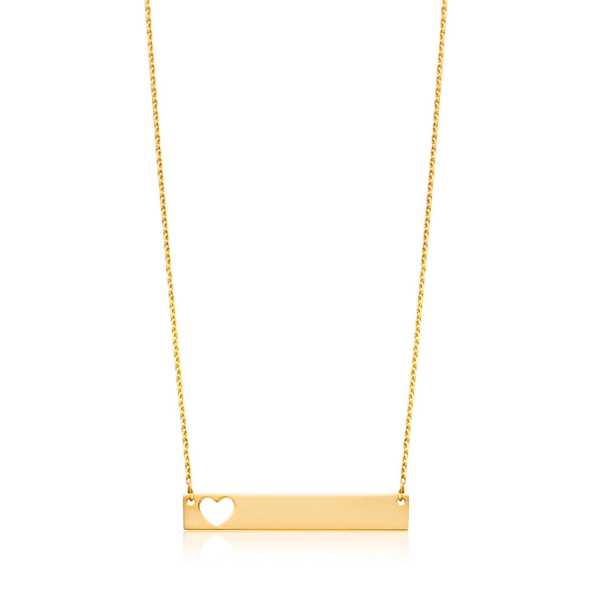 The perfect gold bar necklace with heart cut-out. Available in 10K or 14K solid gold. Chain length is 18″ with additional hook at 16″. Engraving option available. Please allow 2-3 weeks for fabrication.