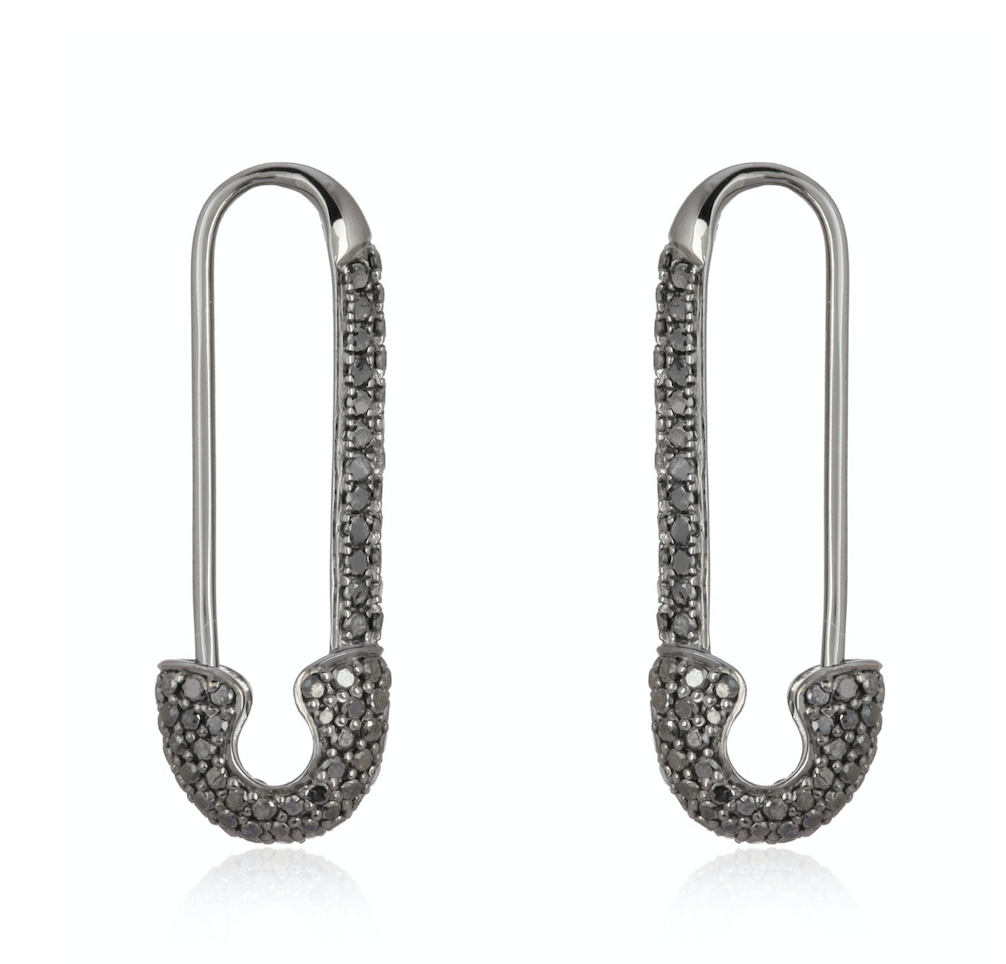 Black Diamond pave safety pin earrings, in 14K white gold with black rhodium finish. These are sold as a single or set, great for mixing and matching with your other earrings! A must have for black diamond lovers or for the edgy soul in you! Black Diamond TCW 1.38 CT (set). Measures 25.5 MM x 8.5MM Please allow 3-4 weeks for fabrication.