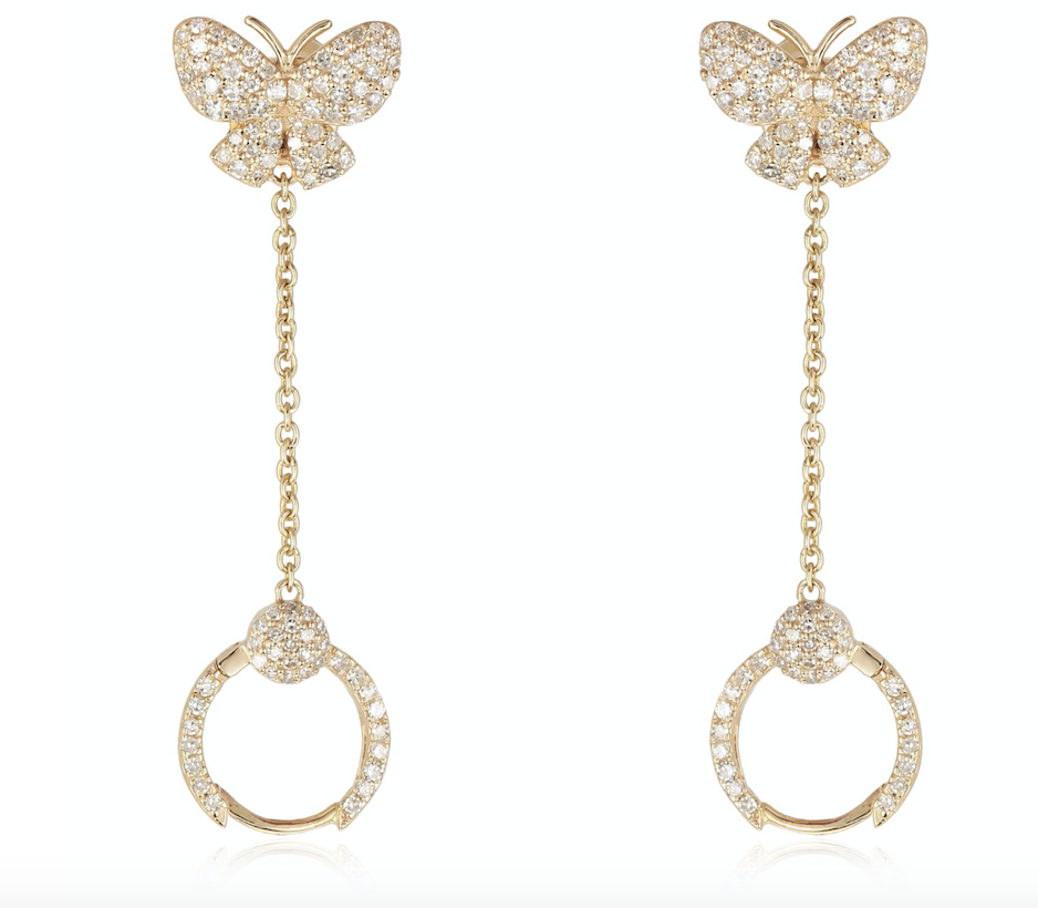 Butterfly Diamond Double Piercing Chain Earring, available as a single or pair, 14k. Earring measures 40 X 11 mm. Diamond TCW 0.32 CT. Please allow 2-3 weeks for production.