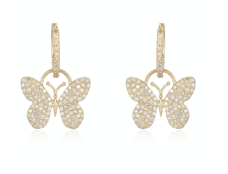 Diamond pave butterfly charms on small diamond pavé buggies, available in 14K Yellow, Rose, or White Gold. Please allow 3-4 weeks for production.