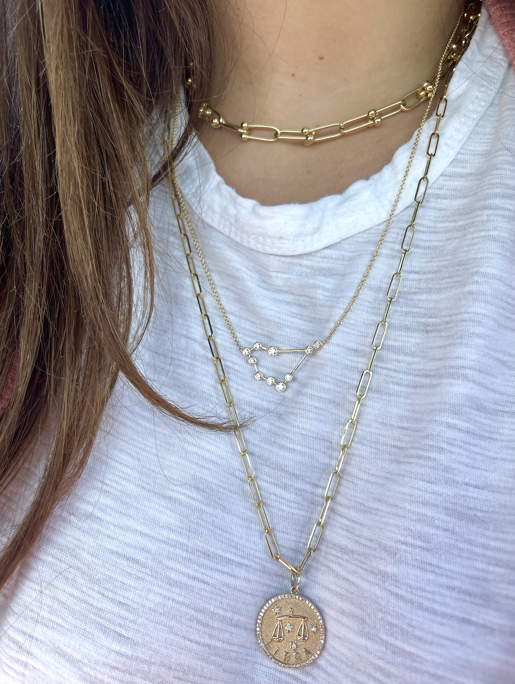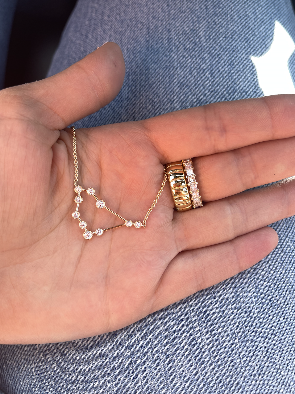 Constellation diamond necklace, available in 14K yellow, white, or rose gold. Diamond total carat weight varies for each zodiac sign, diamonds are SI, G/H. Chain length 18″ with additional hook at 16″. For custom length please leave us a note at checkout. Please allow 2-3 weeks for fabrication.