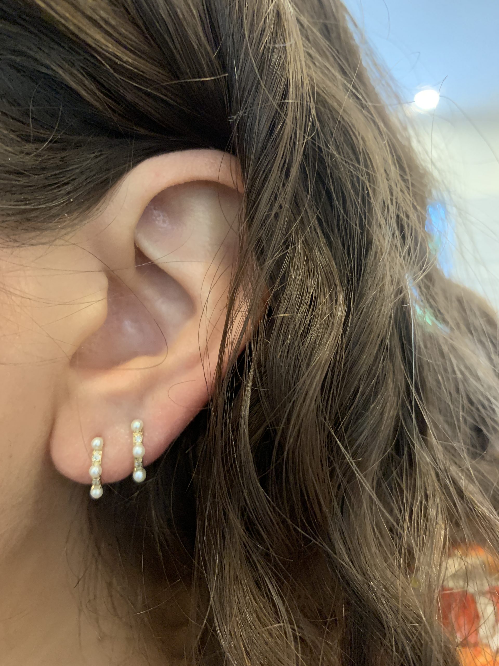 Pearl and diamond pave huggies, available in 14K Yellow Gold, 0.05 TCW.