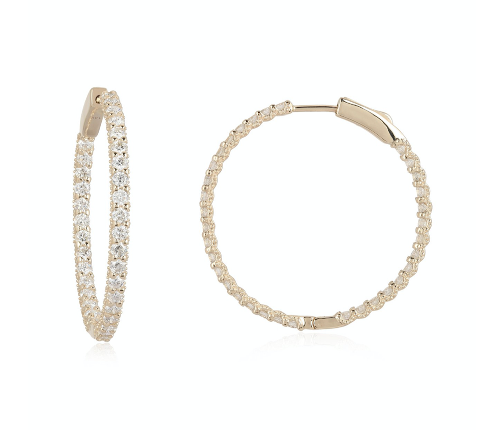 Diamond Hoops, available in 14K white, yellow or rose gold. 29MM in circumfrence, 2.5MM in thickness. Features 1.70 CT of full cut diamonds SI/GH. Please allow 3-4 weeks for production.
