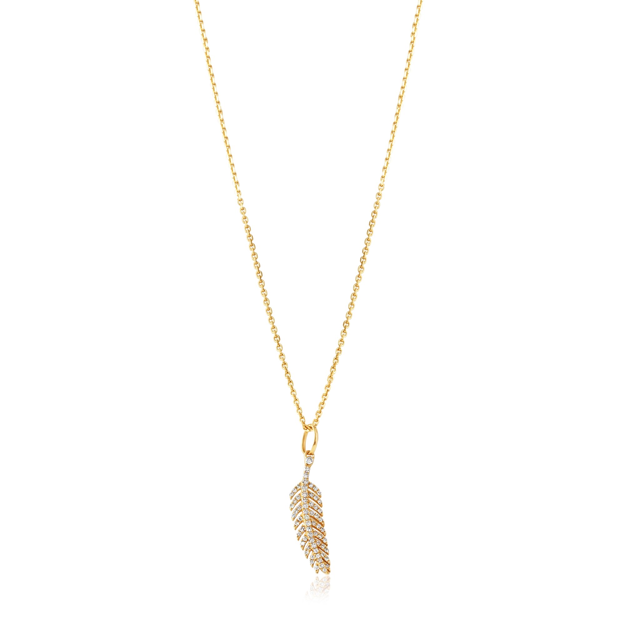 Diamond Lucky Feather Pendant, available in 14K gold and diamond pave. Diamond TCW 0.32 CT. Chain comes included 16″.