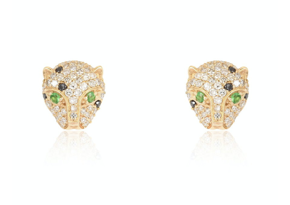 Elegant and timless, these panther studs are hand set with diamonds, black onyx, and tsavorite. Available in 14K Yellow Gold. 10×9 MM in size.