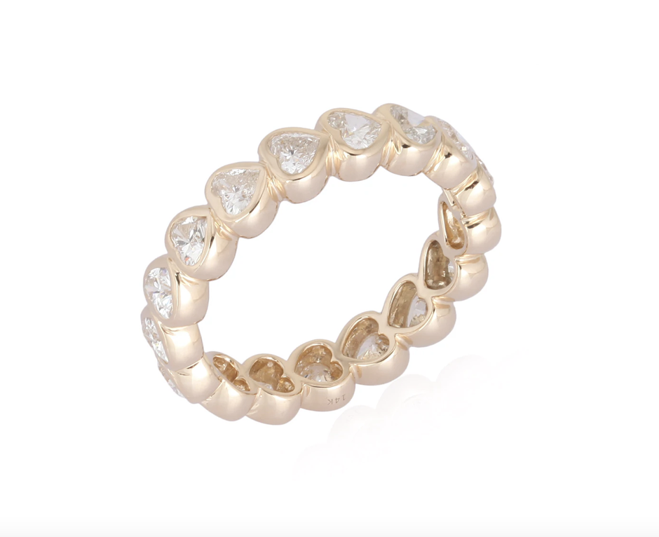 Heart Bezel Eternity Band features 2 Carat of heart cut diamonds, SI/ GH. Diamond carat weight may vary with finger size. Set on 14K or 18K Gold. Please leave your email for a quote and we will be happy to assit you!