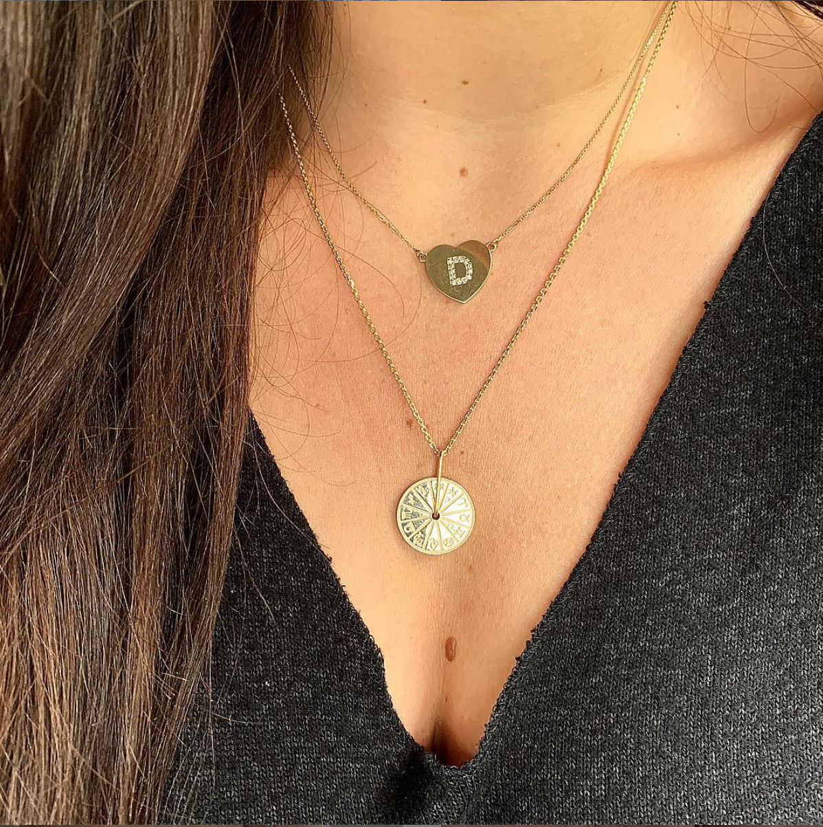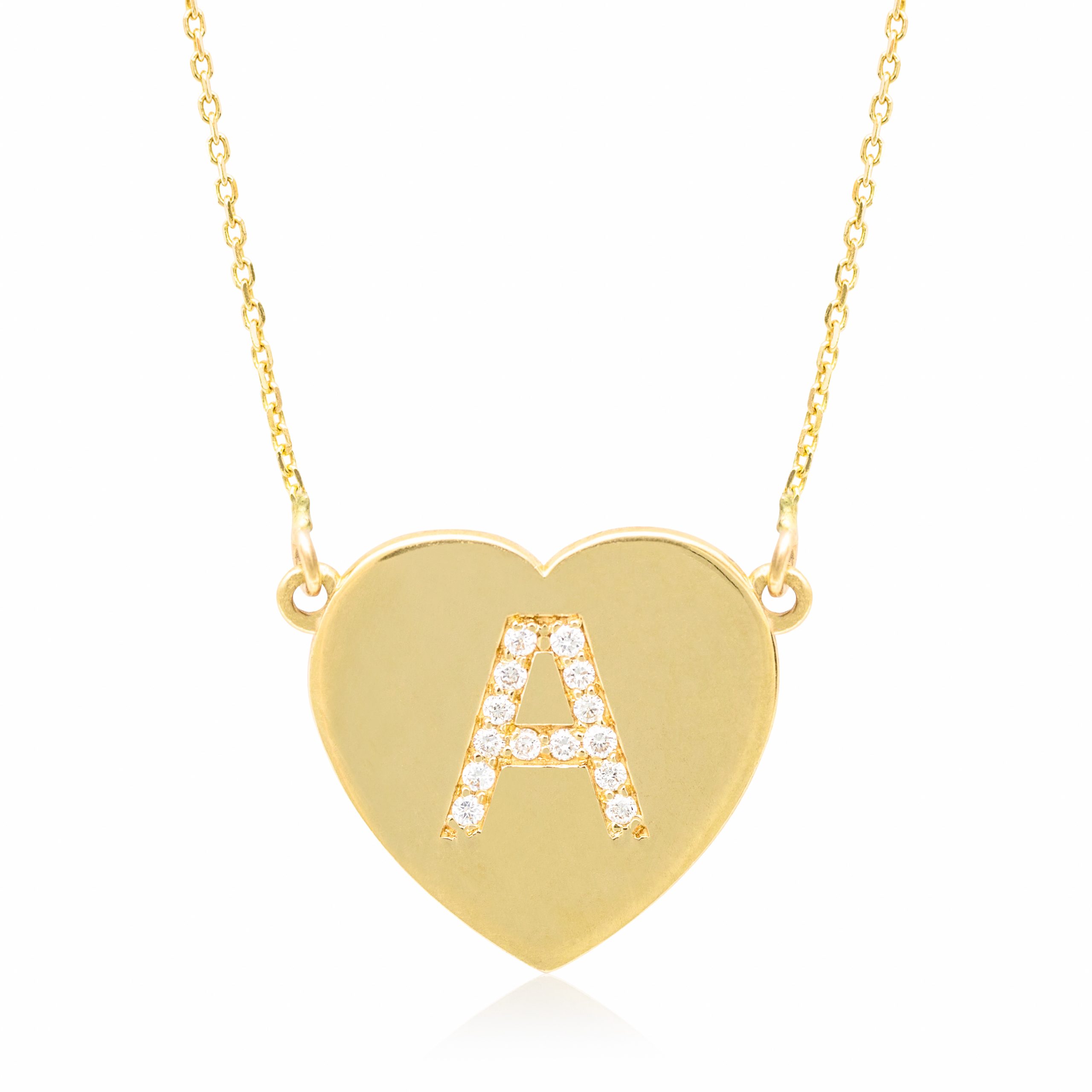 14K heart medallion with diamond pavé, customizable letters available. Chain length 16″. For custom length please leave a note at checkout. Please allow 3-4 weeks for production.