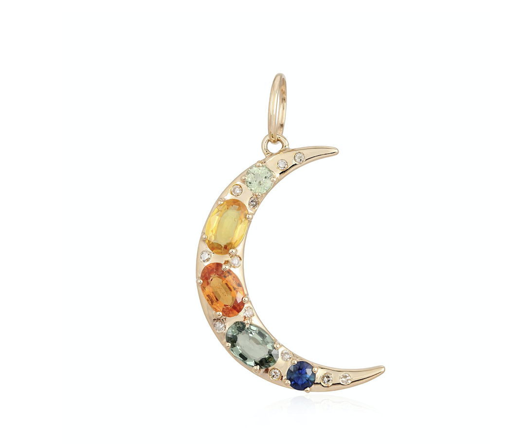 La Luna Charm available in 14K yellow gold and multi sapphire pave. 0.07 CT diamond, 1.98 CT sapphire, 32 X 18 mm. Please allow 3 to 4 weeks for production. Chain Sold Separately.