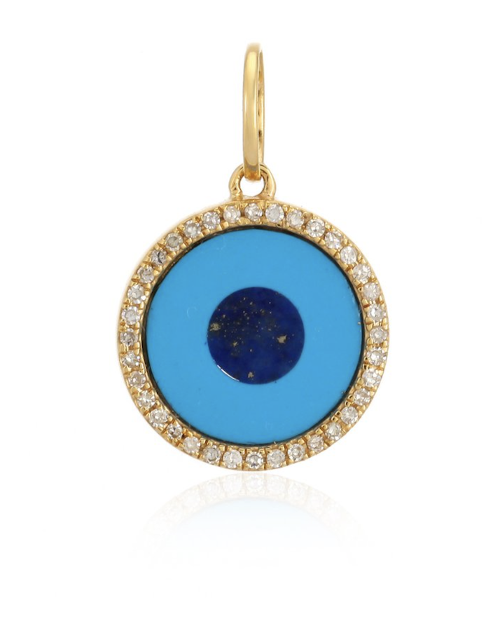 Lapis Lazuli, Turquoise, and Diamond Evil Eye Disc Charm, set on 14K gold with diamond pavé border. Please allow 2-4 weeks for fabrication.