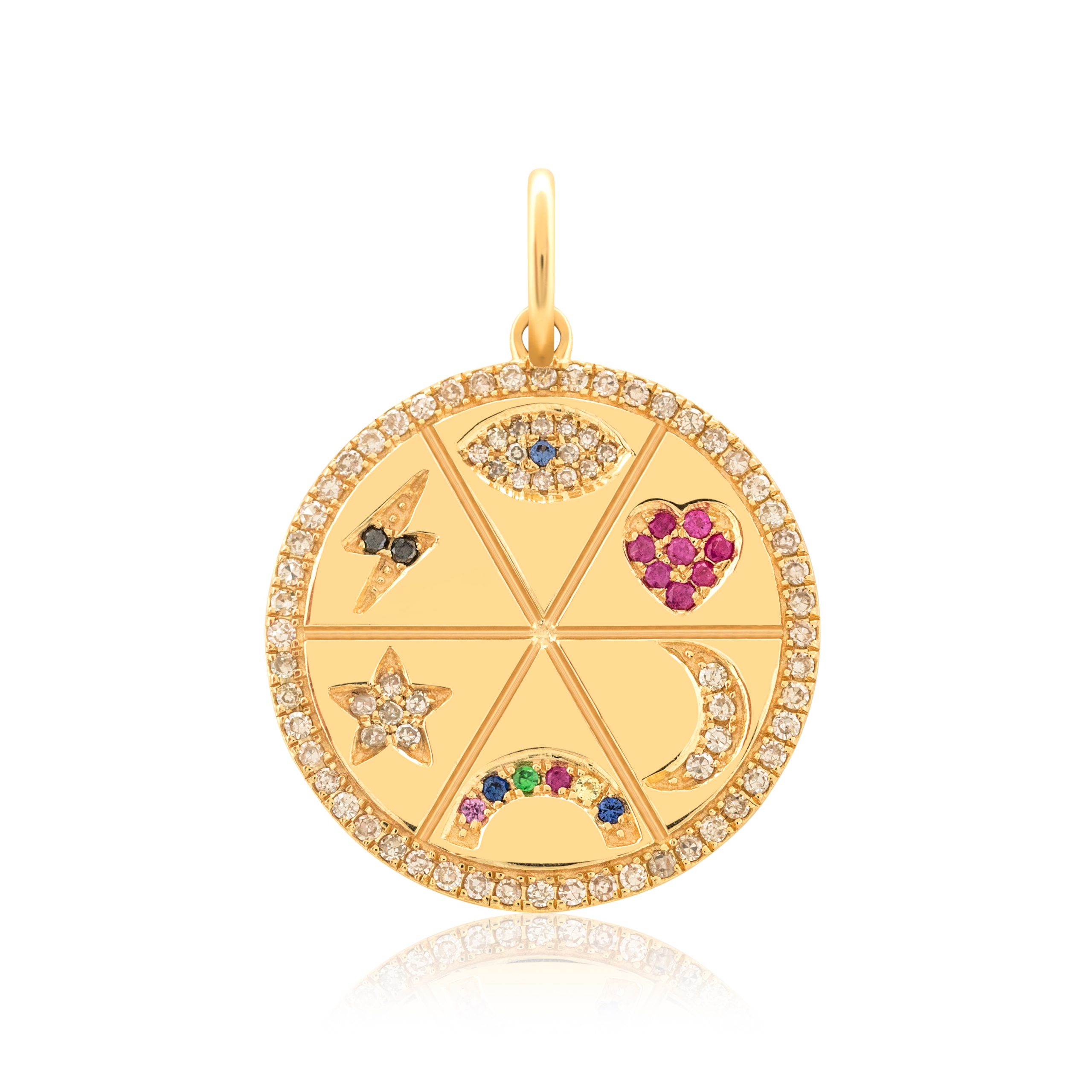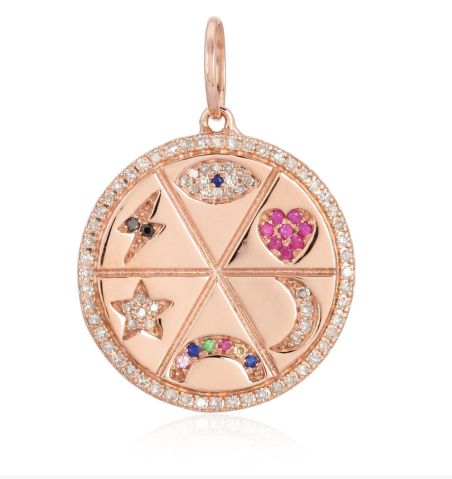 Lucky Rainbow Medallion Charm features diamonds and natural gemstones. One of our favourite charms to add to any chain! Available in 14K Solid Gold, medallion measures 17MM. Please allow 3-4 weeks for production.