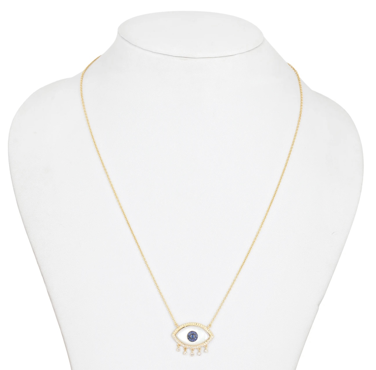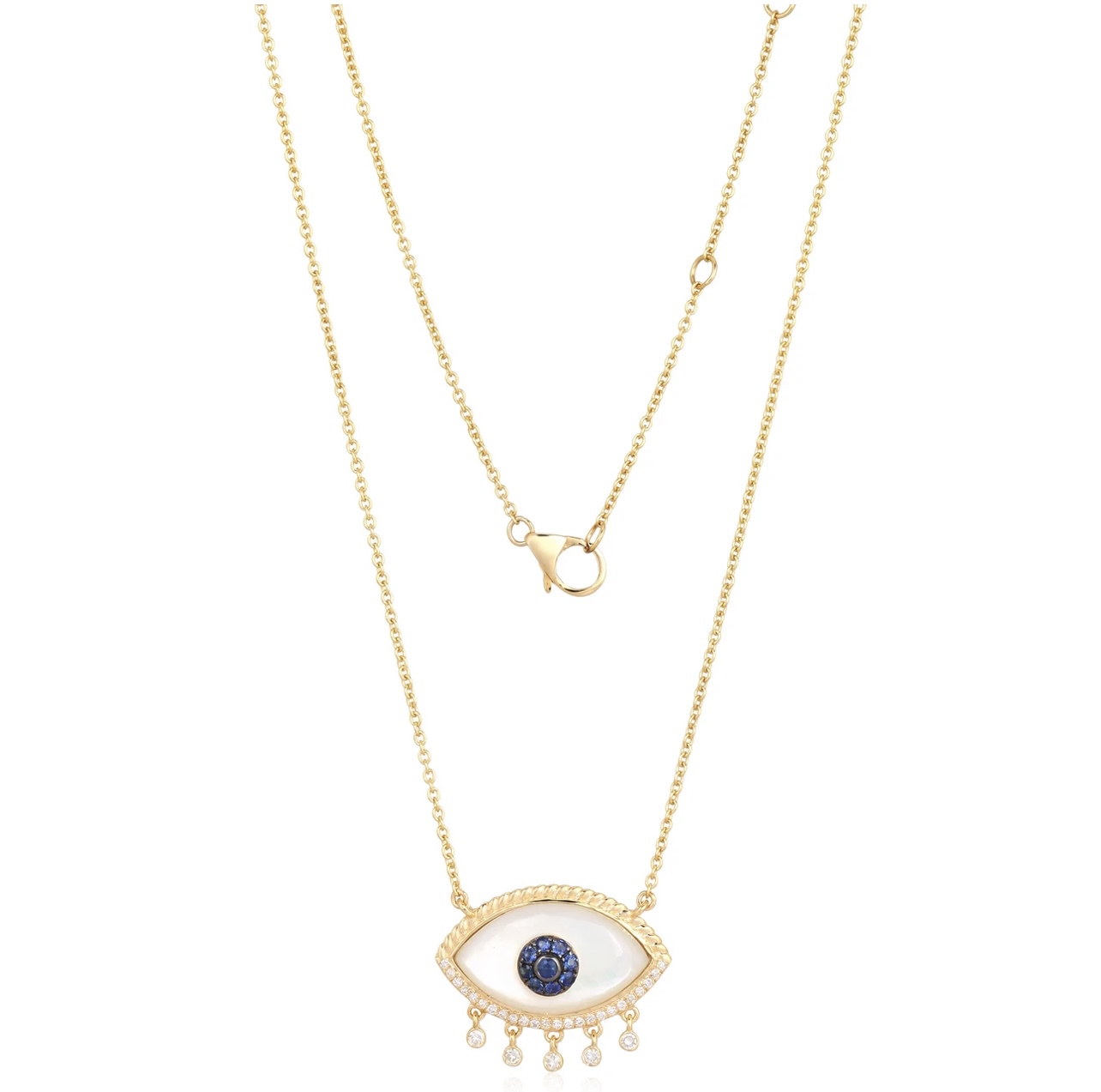 Mother of pearl, diamond and blue sapphire pave necklace, available in 14K yellow gold. Chain is 18′ with an additional hook at 16′. Please allow 3-4 weeks for production.