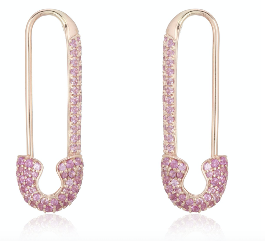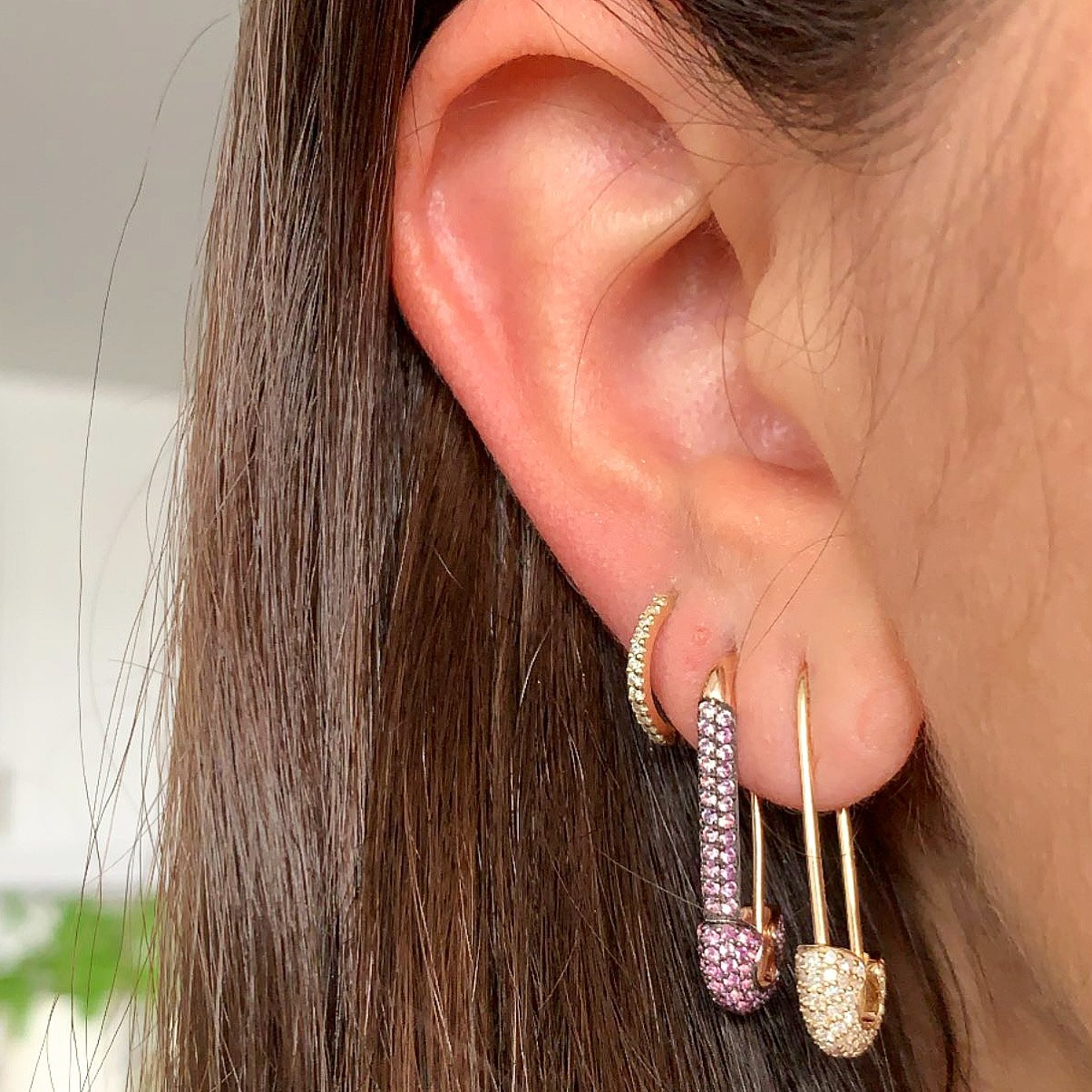 Pink Sapphire Safety Pin Earrings, available for purchase as single or pair. Available in 14K rose gold, natural pink sapphires TCW 1.38 CT. Measures 25.5 MM x 8.5MM. Please allow 2-3 weeks for fabrication.