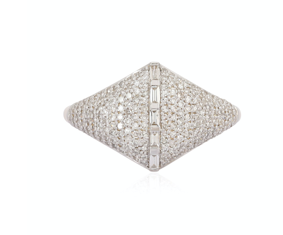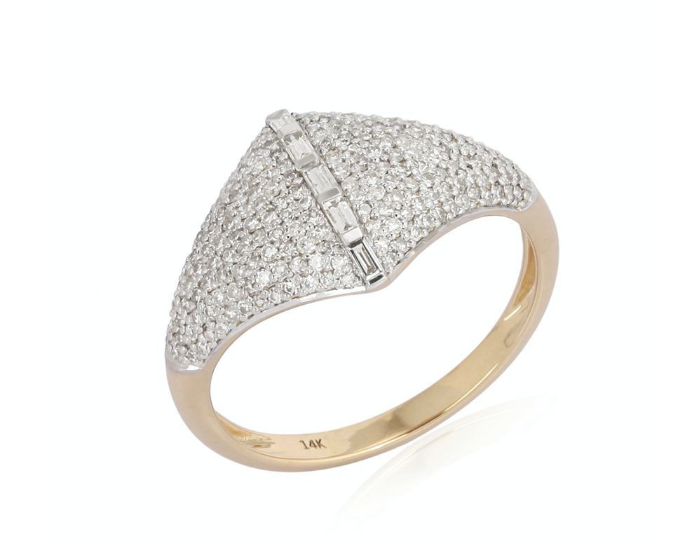 Available in 14K, features diamond pave 0.60 CT, and baguette detail diamonds 0.11 CT. Please allow 2 to 3 weeks for production.