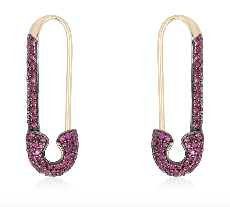 Ruby Safety Pin Earrings, available for purchase as single or pair. Available in 14K yellow gold, natural rubies TCW 1.61 CT. Measures 25.5 MM x 8.5MM. Please allow 2-3 weeks for fabrication.