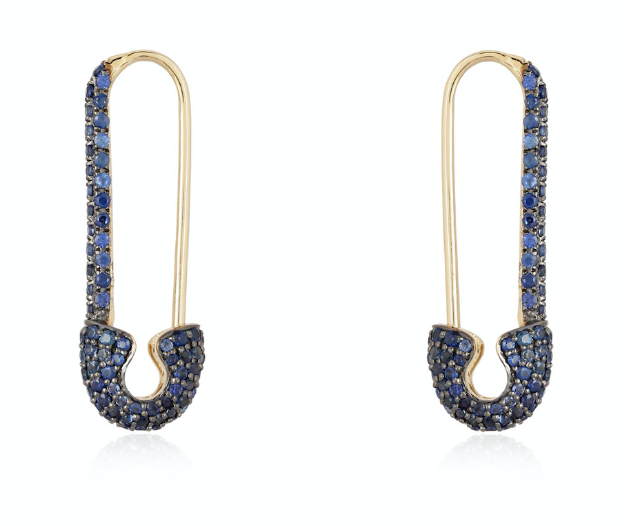 Sapphire Safety Pin Earrings, available for purchase as single or pair. Available in 14K yellow gold, natural blue sapphires TCW 1.51 CT. Measures 25.5 MM x 8.5MM. Please allow 2-3 weeks for fabrication.