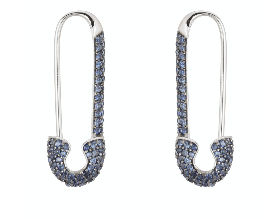 Sapphire Safety Pin Earrings, available for purchase as single or pair. Available in 14K white gold, natural blue sapphires TCW 1.51 CT (set). Measures 25.5 MM x 8.5MM. Please allow 3-4 weeks for fabrication.