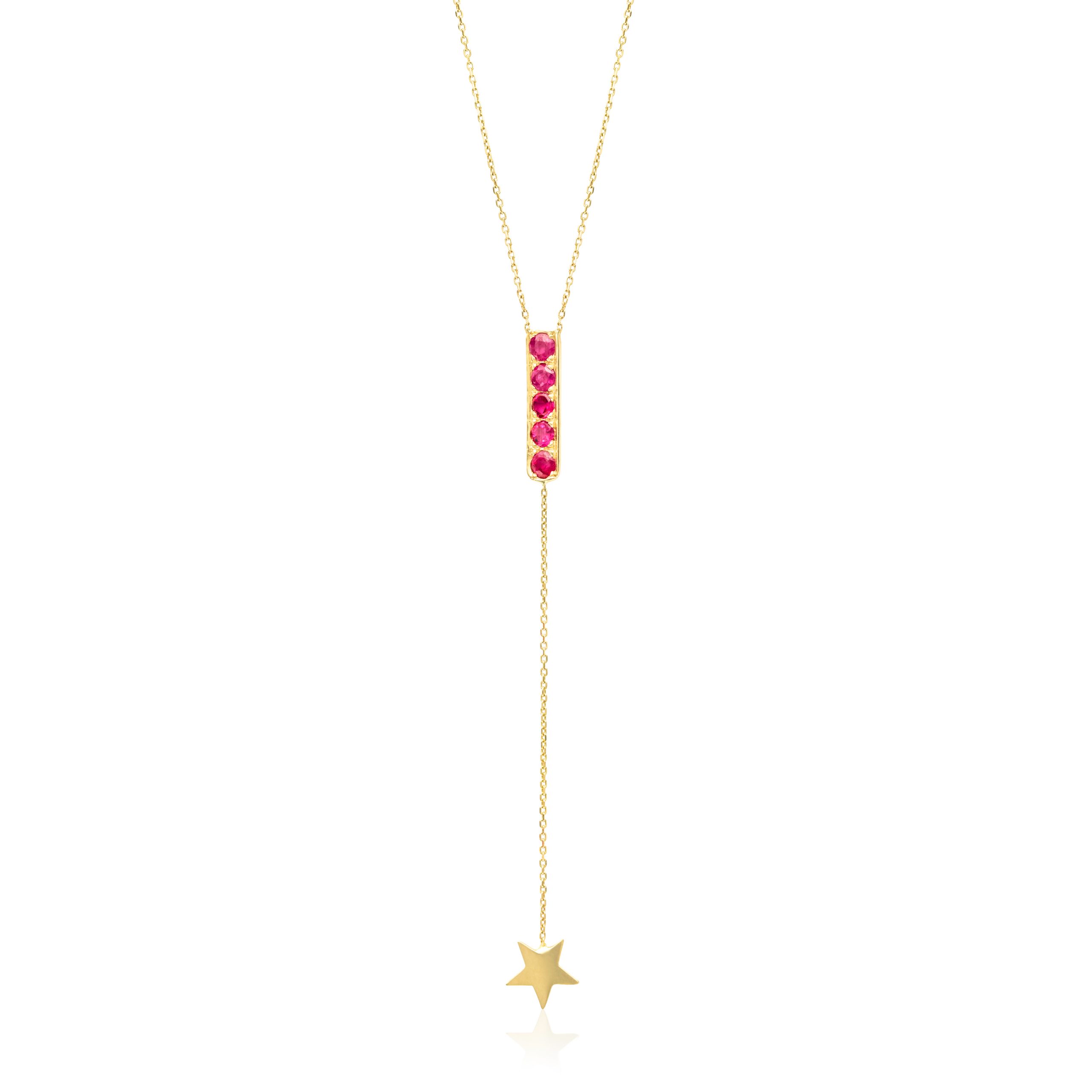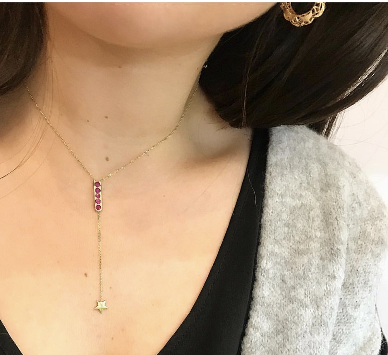 14K solid gold star lariat with natural burmese ruby pavé. Chain length is 16″ with 15″ hook. Available with other stones. Custom chain lengths available, please leave a note at checkout.