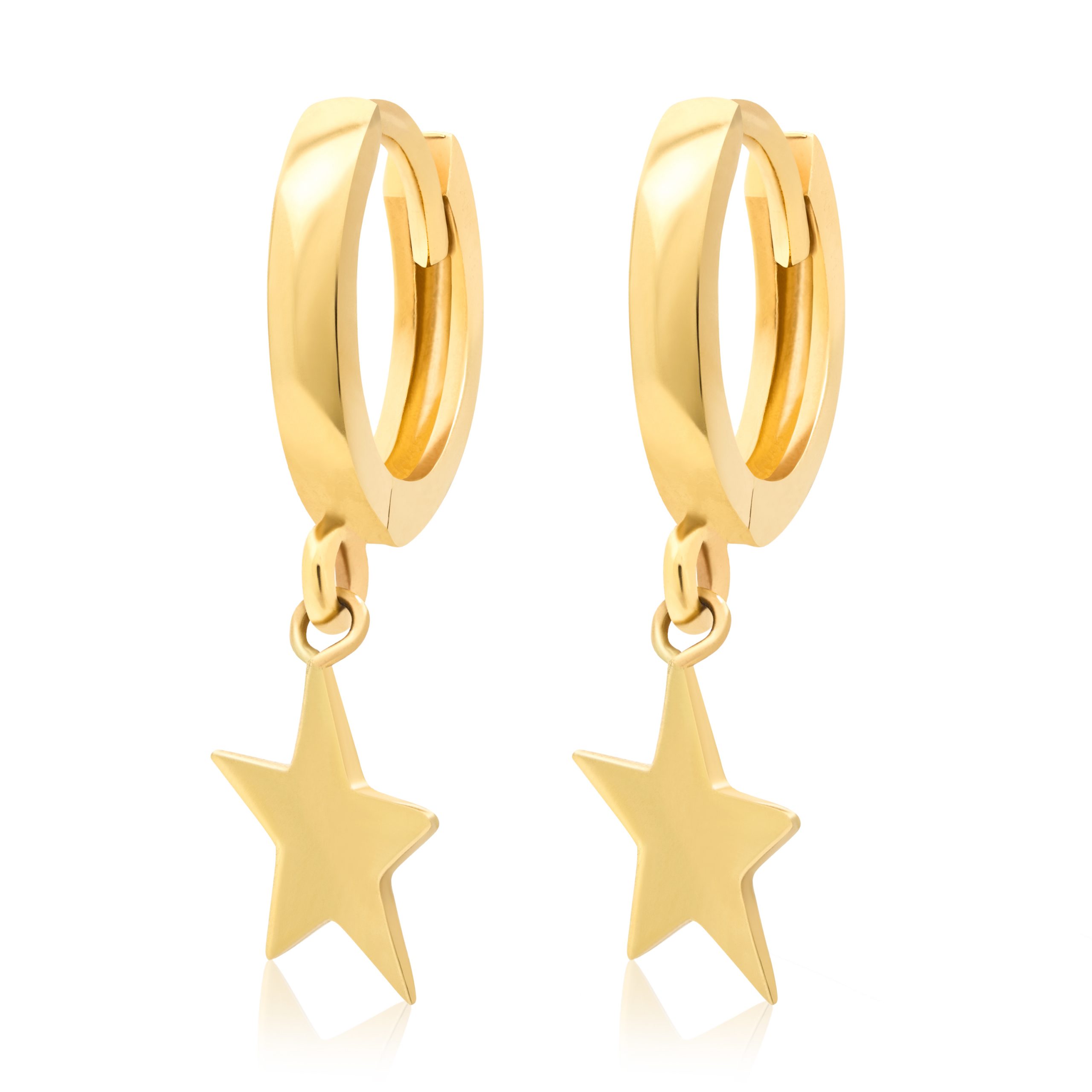 Our 14K dangling star huggies will definetely be a staple for your ear game line-up! Available in 14K white or yellow gold. Please allow 3-4 weeks for production.