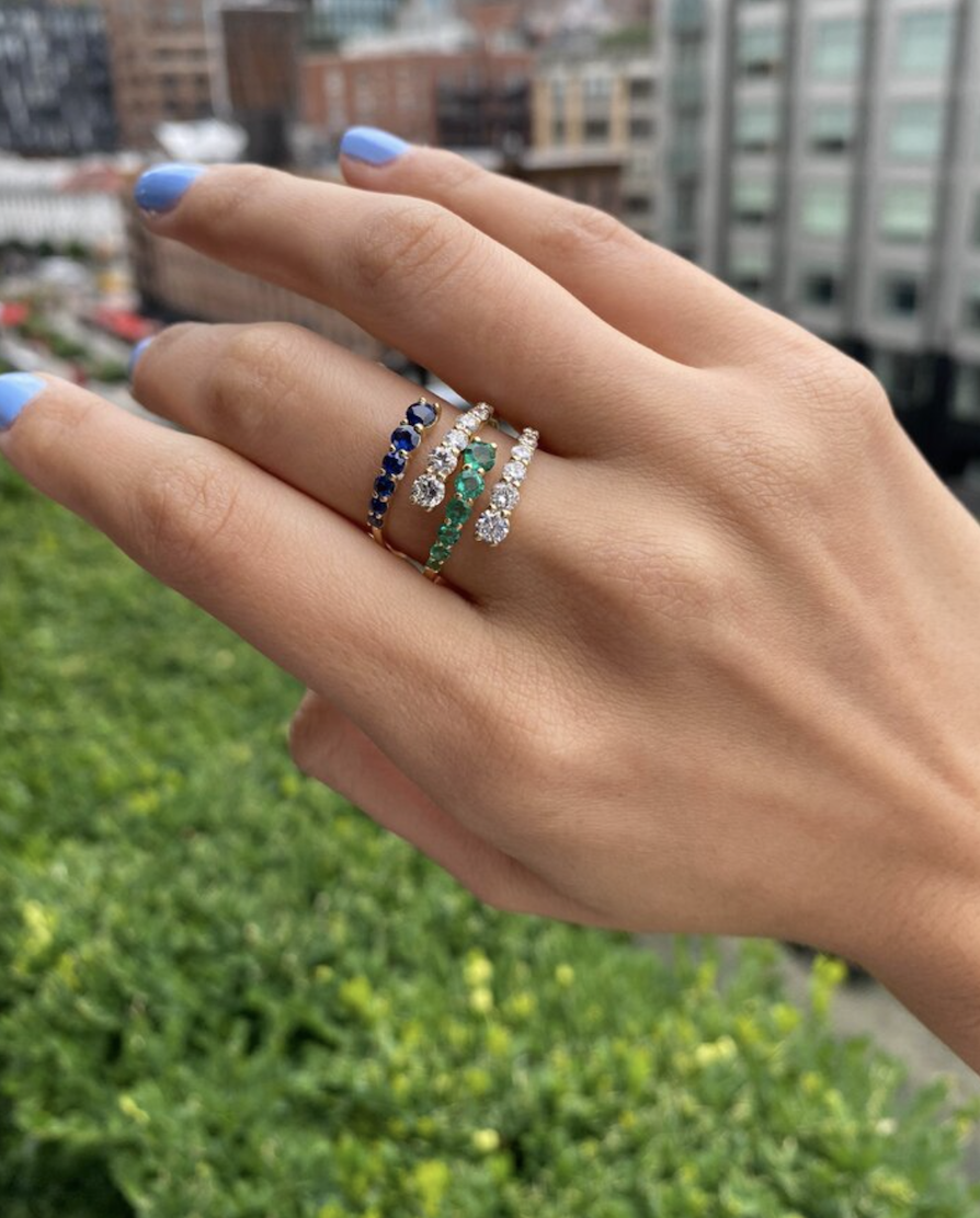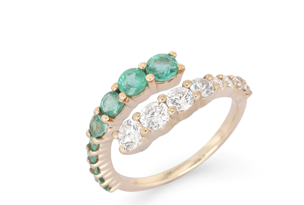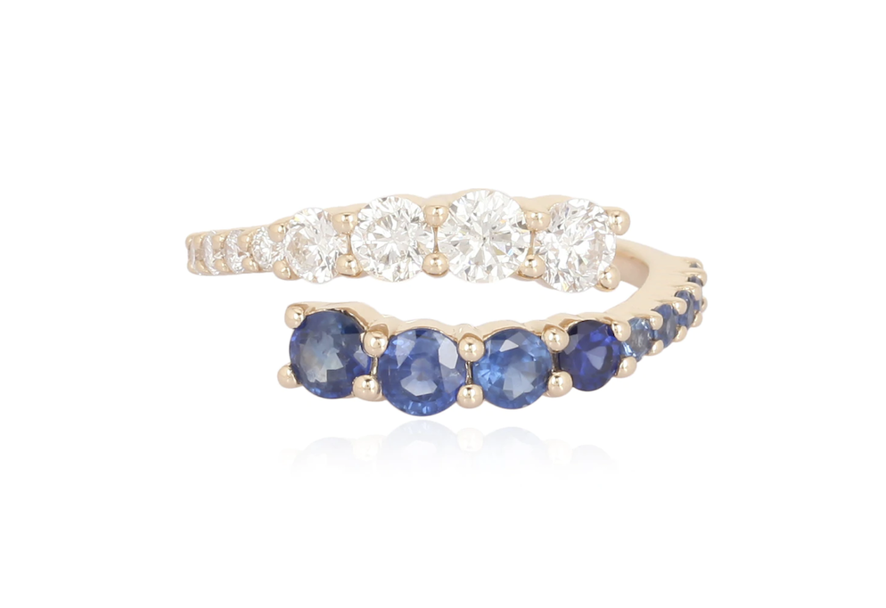 The Half & Half Twisted Ring, available in 14K yellow, white or rose gold. Featured in half Diamond with options of half Blue Sapphire, Ruby or Emerald. Diamond Weight, 1.30 TCW, SI GH. Please allow 4-6 weeks for production.