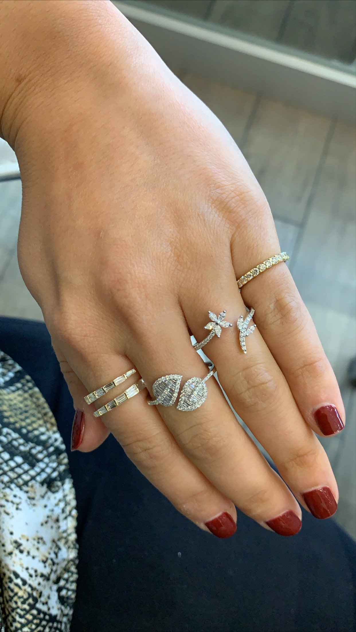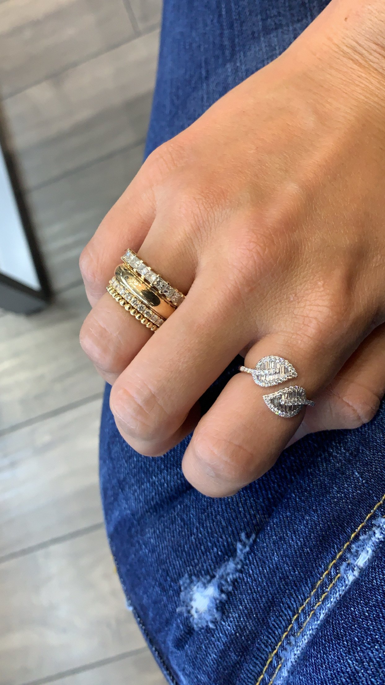 The Leaf Ring, features baguette and round diamonds that pavé half way. The diamonds are VS2 G/H, TCW 0.70 CT. Available in 14K white, rose, or yellow gold. Please allow 3-4 weeks for fabrication.