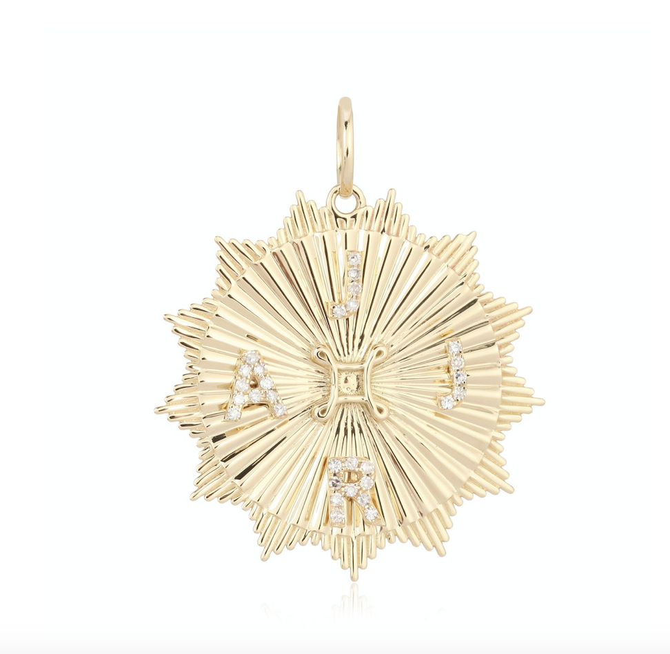 Available in 14K, with up to 4 diamond initials. Please include all initials in the box below. Initials are made in diamond pave. Medallion is 29 MM. Chain sold seperatly. Please allow 3 to 4 weeks for production.