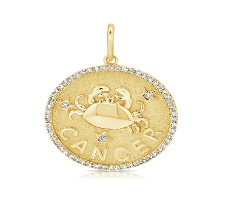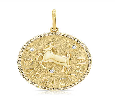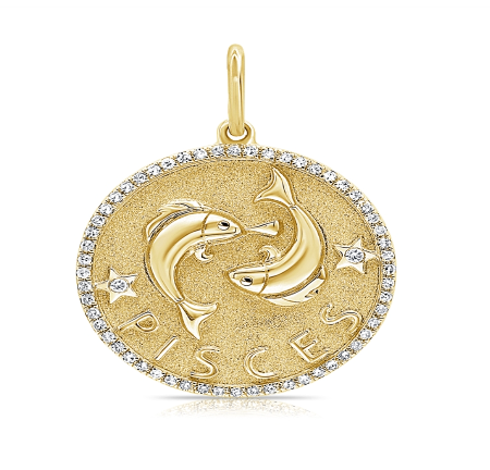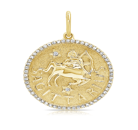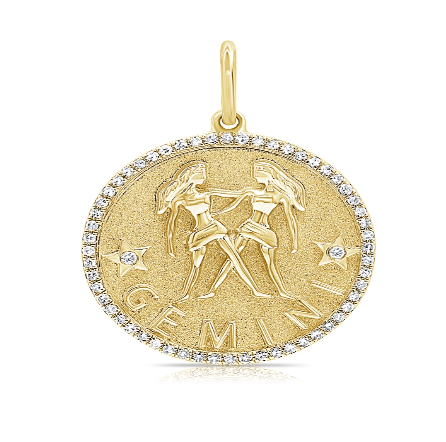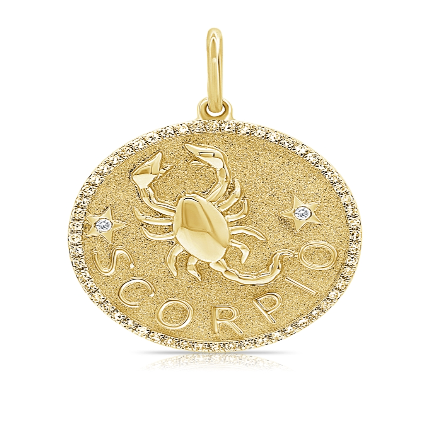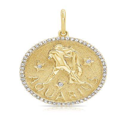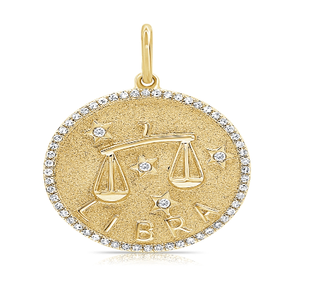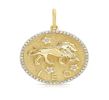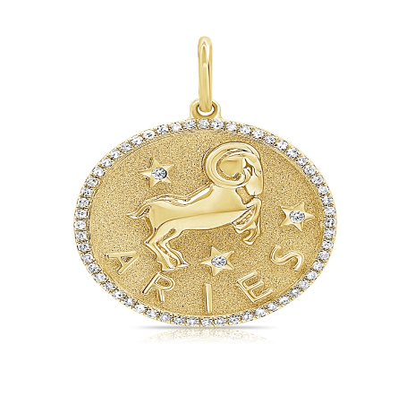 Zodiac Medallion with diamond pavé border, available in 14K Yellow Gold, diamonds are Si G/H. Medallion comes with a standard rolo chain, 18″ with a hook at 16″. For custom chain length, please leave us a note at checkout. Please allow 3-4 weeks for fabrication.