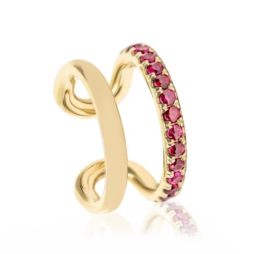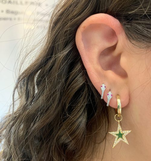 Diamond pave snake huggies, featuring ruby accents on eyes. Available […]